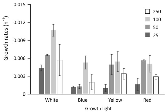 Cyanidioschyzon merolae cells were grown at four selected light intensities (25, 50, 100, and 250 μmol photons m−2 s−1) in a multicultivator (PSI, Czechia) at four wavelengths: blue (B, 450 nm), yellow (Y, 615 nm), red (R, 660 nm), and white (W, control) light at 40 °C with constant aeration of 0.5 dm3 min−1. The growth curves were automatically recorded at 680 and 720 nm. Growth rates were calculated from an average of at least three measurements of a 7-day culture at OD 720 nm for comparison purposes. It was concluded that growth strongly depends on both the intensity of light and the quality of growth light (Figure 1). The fastest and optimal growth was observed in the W at 100 μmol photons m−2 s−1. The higher light intensity (250 μmol photons m−2 s−1) resulted in ≈50% reduction in growth rate. The effect was similar in the case of a lower light intensity (50 μmol photons m−2 s−1), with a further reduction, to ≈30% in 25 μmol photons m−2 s−1. All monochromatic lights caused a reduction in the growth rate, down to at least 50% of the white control. The B light exhibited possibly the greatest reduction in the rate of growth at all light intensities compared with white light of the relevant intensity. The least affected was the culture grown at 100 μmol photons m−2 s−1 of B, where it achieved ≈50% white light control similar to other monochromatic lights of 100 μmol photons m−2 s−1. Both R and Y light exhibited similar growth characteristics in all light intensities, with a 70% reduction in 25 μmol photons m−2 s−1. It was observed that the Y and R light of 50 and 100 μmol photons m−2 s−1 had almost identical effects on the growth rate and spanned the apparent optimum of growth.