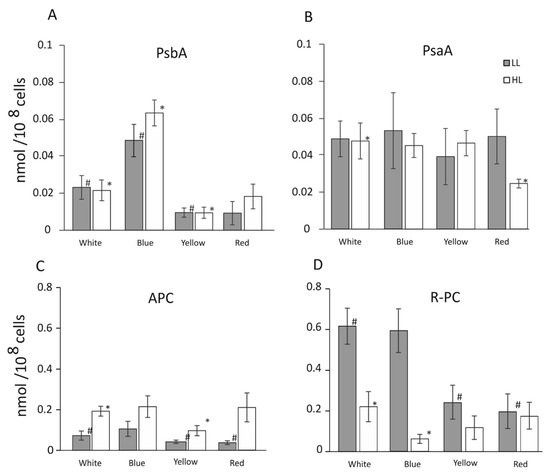 Effect of W, B, Y, and R light of low intensity (gray bars, LL) and high intensity (white bars, HL) (25 and 100 µmol photons m−2 s−1) on the levels of proteins PsbA (A), PsaA (B), APC (C), and R-PC (D) in C. merolae cells. Immunoblot densitometric measurements were repeated at least 3 times. The t-test (T.TEST, Excel, Microsoft) returned statistically significant results (p < 0.05) that were indicated by * and # and applied to the high and low light controls, respectively.