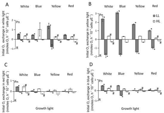The initial photosynthesis (Pn) and respiration (R) rates of C. merolae cells measured in white (A), yellow (B), red (C), and blue (D) light at LL (gray bars) and HL (white bars) (25 and 100 µmol photons m−2 s−1). Oxygen exchange was measured at all light intensities for cells under different light growth conditions. Respiration rates were measured in darkness 5 min after the onset of photosynthesis. Results are the mean ± SD of at least three independent experiments. The t-test (T.TEST, Excel, Microsoft) returned statistically significant results (p < 0.05) for Pn and R, separately, which were denoted with * and # and applied to the high and low white light controls, respectively.