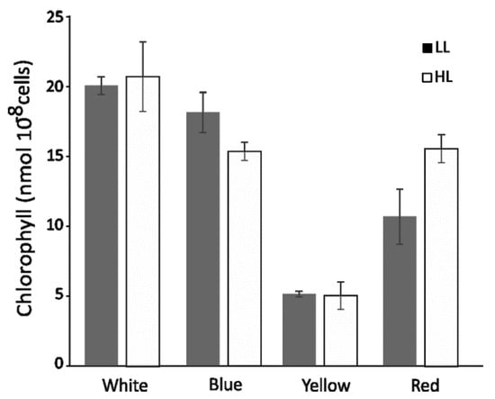 Chlorophyll a concentration in C. merolae cells growing in white, blue, yellow, and red light. Low (LL) and high (HL) intensity of growth light is marked with gray and white bars, respectively. Results are mean ± SD of at least three independent experiments.