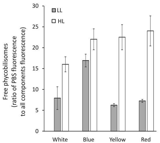 It was observed (Figure 5) that in high light intensity, during cell growth in all light qualities, the level of free phycobilisomes increased compared to low light conditions. The fluorescence ratio of the cells grown only under low blue light was two times higher than the control conditions under white light, which indicates double amounts of free phycobilisomes. Other light qualities (Y and R) showed a ratio of the free phycobilisomes similar to those of the white control. The high light intensity of all growth light colors increased the number of free phycobilisomes by ≈20% as compared to white light. In the growth conditions of Y and R-HL, the level of free phycobilisomes increased about three times compared to low light.