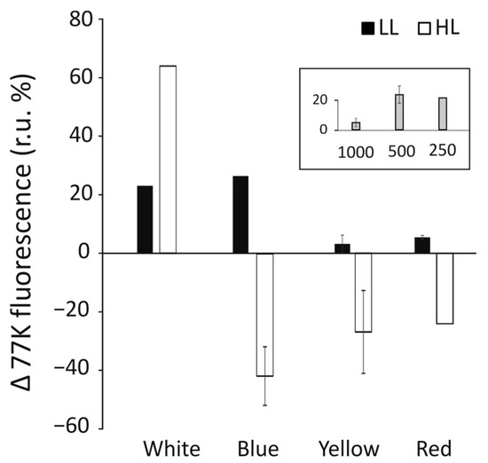 Changes in the relative rate of fluorescence intensity (in %) of free phycobilisomes after light pulses of 500 µmol photons m−2 s−1 of C. merolae cells growing in white, blue, yellow, and red light. The low (LL) and high (HL) intensity of growth light are marked with black and white bars, respectively. Insert: Changes in fluorescence intensity of white low-light grown cells upon light pulses of three selected intensities (250, 500, and 1000 µmol photons m−2 s−1).