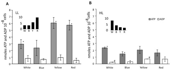 Concentration of ATP and ADP in C. merolae cells grown in low light ((A), 25 μmol photons m−2 s−1) and high ((B), 100 μmol photons m−2 s−1) (W), blue (B), yellow (Y), and red (R). The amounts of ATP and ADP are marked with gray and white bars, respectively. The insets show the ATP/ADP ratios. The t-test (T.TEST, Excel, Microsoft) returned statistically significant results (p < 0.05) marked as * for ATP and # for ADP.