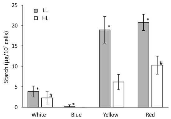 Starch accumulation in C. merolae cells grown in W, B, Y, and R light at LL (gray bars) and HL (white bars) intensity. The t-test (T.TEST, Excel, Microsoft) returned statistically significant results (p < 0.05) marked * for LL and # for HL.