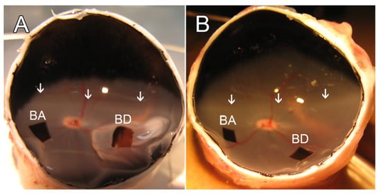 Pig eyes after enucleation and fixation. (A) A right eye 2 h after the formation of a detachment. The retinal detachment is present in the nasal inferior retina, below the area centralis (arrows). The boxes indicate the location of samples removed for sectioning. BD, sample of detached retina; BA, sample of attached retina. (B) A right eye two days after formation of a detachment. The detachment has spontaneously reattached. BD, sample of formerly detached retina; BA, sample of attached retina. Arrows indicate the area centralis, which extends from nasal to temporal retina.