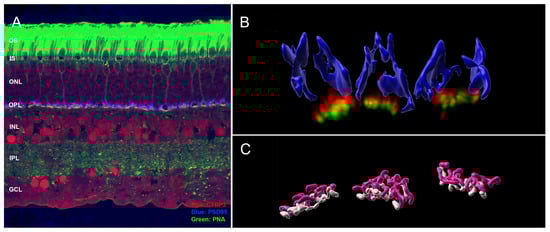 - Blanks, J.C.; Johnson, L.V. Specific binding of peanut lectin to a class of retinal photoreceptor cells. A species comparison. Investig. Ophthalmol. Vis. Sci. 1984, 25, 546–557. [Google Scholar]
