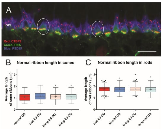 (A) Normal retina seen with conventional confocal microscopy. Cone pedicles (ovals) lie amongst rod spherules. Cone ribbons lie just above the PNA, whereas rod ribbons occupy a band about 5 μms wide and surround the pedicles. A stack of similar images was used to quantitate the length of photoreceptor ribbons. (B) The length of cone ribbons. The size of ribbons is relatively consistent across the inferior nasal and temporal retina. n = 2 animals. (C) The length of rod ribbons. Rod ribbons are longer than cone ribbons but also consistent in size across the inferior retina. n = 2 animals. OS, left eye, OD, right eye. For box plots, whiskers are 1.5X IQR; dots are outliers. Bar = 10 μm.