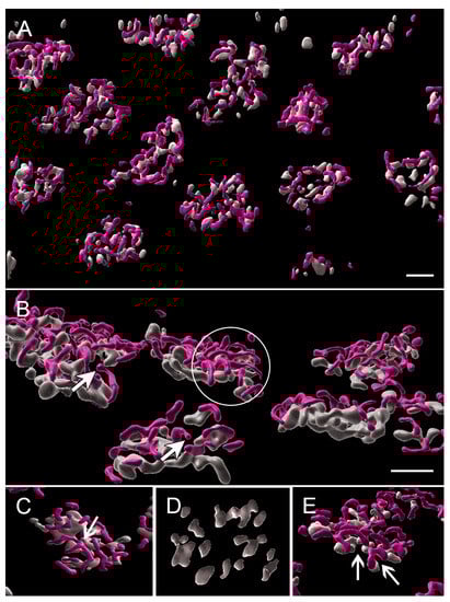 Normal retina from a stack of images taken with STED microscopy; fluorescent label was surface rendered. (A) The cone pedicles are regularly arrayed in this en face view. The PNA (gray) creates loose aggregates or islands of labels outlining the base of the pedicle. Ribbons (pink) appear as a loose network over the PNA label. (B) Most ribbons are single with a distinct horseshoe curvature (circle). Occasional swellings or knobs (arrows) appear along the ribbons. (C) Ribbons can also be in more complex branched configurations (arrow). (D) The aggregates of PNA are usually circular or oval. The spaces between the PNA are likely to be openings to synaptic invaginations. (E) Synaptic invaginations (arrows), defined by the curved ribbons, are bordered by a PNA label at the base of the pedicle. Bars = 2 μm.