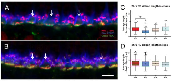 2 h after detachment. (A) Detached retina, untreated. Although ribbons are present in most pedicles, the arrows indicate pedicles with reduced and shortened ribbons. Rod ribbons are present between the pedicles. (B) Detached retina treated with AR13503. All pedicles have ribbons (arrows). (C) Length of cone ribbons decreased significantly in the untreated retina (BD) compared to the treated retina (AD), * p < 0.0001. There was no significant difference in ribbon length in attached retinas whether treated or not (BA vs. AA). n = 3 animals. (D) Length of rod ribbons showed no differences in the treated vs. untreated eyes in detached and attached retinas. n = 3 animals. For box plots, whiskers are 1.5X IQR; dots are outliers. Bar = 5 μm.