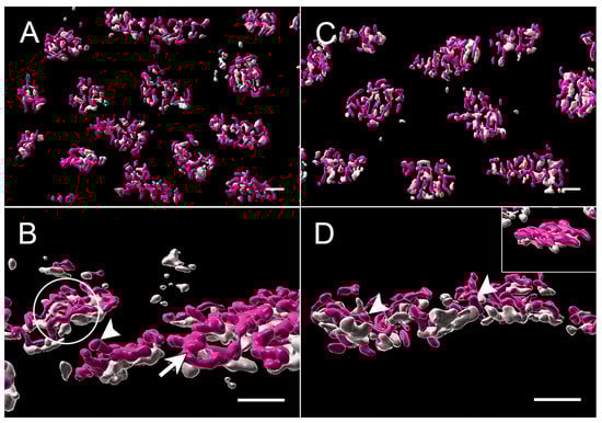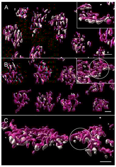 Under certain circumstances, both cone and rod ribbons are known to be plastic, changing shape from elongated plates, as seen with EM, to plate-like structures with swellings along the edges which serve to remove material from the ribbon to spherical electron-dense bodies that no longer appear as ribbons although they continue to be coated with attached synaptic vesicles. Spherical ribbons are usually detached from the active zone and found floating in the cytoplasm of the presynaptic terminal. These changes in size and shape have been reported to occur during the diurnal light phase, most notably in some strains of mice, with hibernation and a decrease in synaptic activity []. Moreover, the changes are reversible, with the greatest ribbon lengths achieved just after dark, along with increased visual sensitivity []. The knobbiness of porcine cone ribbons, as observed in 3D STED stacks of images, likely represents either (1) the process of reduction in ribbon size as spherical aggregates from elongated ribbons detach during periods of inactivity caused by detachment or (2) the reformation of ribbons after reattachment. In our specimens, the highest degree of knobbiness was seen in treated retinas, where the treatment had been delayed by 2 h. Additionally, small aggregates of ribbon labels were present unassociated with PNA-labeled synaptic bases. In the untreated fellow eyes, ribbon lengths were the shortest we observed. Treatment, therefore, may have halted the process of reduction mid-stream, leaving misshapen ribbons and free-floating ribbon spheres. Some knobs or protrusions are also present even after retinal reattachment.