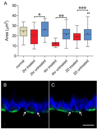 With STED imaging and Imaris rendering, some pedicles of untreated retina appeared to be sparsely covered with ribbons. Cone ribbons also looked reduced in length with STED microscopy as quantitatively described above; the anastomoses of ribbons seen in the normal retina were less frequent, and the arched shape of the ribbons appeared more shallow (Figure 6). In a normal retina, the ribbon follows the curvature of the synaptic invagination; thus, the flattening of the ribbons strongly suggests there was some flattening of the invagination. Flattening of synaptic invaginations in cone pedicles has been previously described in detached retinas, but the data come only from detachments of three days duration or longer []. In contrast, in the treated, detached retina, most ribbons were normally arched, although some loss of the characteristic horseshoe shape in the treated retina could be found (Figure 6). Finally, the bases of the pedicles were significantly smaller in area, as determined by the PNA label, in the treated retina compared to the untreated retina (negative-binomial model, p = 0.0004, Figure 7) and compared to normal (p = 0.003). Immunohistochemical expression of PNA is relatively stable in detached rat retina compared to S cone opsin []; in the detached feline retina, the PNA label does not decrease for several days and remains at the synaptic terminal even after the labeling in the interphotoreceptor matrix has disappeared []. Changes in measurements based on the PNA label, therefore, are unlikely to be due to changes in PNA expression.