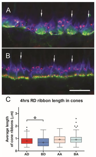 4 h after detachment. (A) Detached retina, untreated. Pedicles are rounded in shape (arrows), and cone ribbons are short. Rod ribbons are present above (distal to) the base of the pedicles. (B) Detached retina treated with AR13503 after a two-hour delay. Pedicles have the more usual triangular shape (arrows), and ribbons appear longer. (C) Length of cone ribbons in the untreated detached retina (BD) is significantly smaller than those in the treated retina (AD), * p < 0.05. Length of ribbons in attached, untreated, and treated retinas (BA vs. AA) showed no significant differences. n = 4 animals. For box plots, whiskers are 1.5X IQR; dots are outliers. Bar = 5 μm.