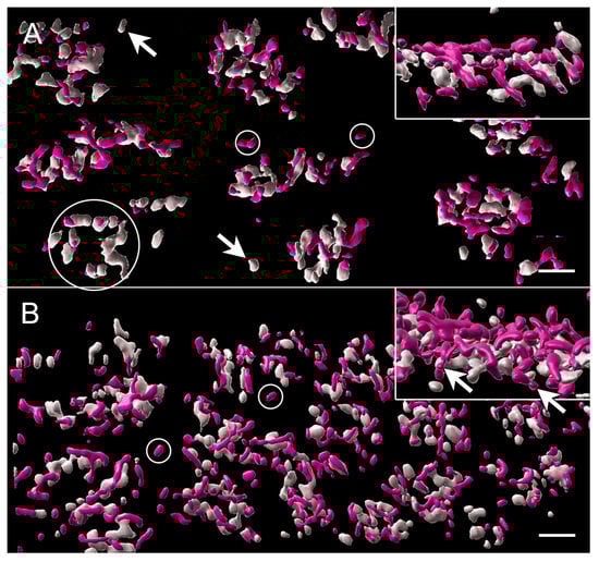 4 h after detachment. (A) Detached retina, untreated. PNA aggregates (gray) have reduced numbers of ribbons (pink), which appear generally shorter than normal and, in some cases, thinner. Some pedicle bases are nearly devoid of ribbons (circle). Isolated PNA labels (arrows) and ribbons (small circles) are present. Many ribbons are flattened against the pedicle base (inset). (B) Detached retina, treated. Pedicles appear more tightly arrayed than in the untreated retina. There are more ribbons associated with the PNA label but also some isolated ribbon fragments (circles). Some ribbons are arched, and many have “knobs” along their lengths and at their ends (inset arrows). STED microscopy with surface rendering. Bars = 2 μm.