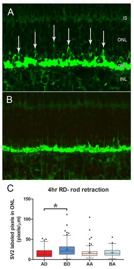 As above, two samples (BA, BD or AA, AD) from each eye, four samples per animal, were obtained (Figure 1); 30–45 images were taken of each retina sample, and data were collected from 2 to 4 sections per sample, examining at least three different areas of each section. SV2 immunolabeling in the ONL was analyzed as described []. Briefly, a binary mask was created for each image, the ONL was outlined, and the labeled pixels in the ONL were counted using ImageJ software (version 1.45s; NIH). The measurements are reported as pixels per micrometer of ONL length.