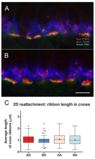 Two days after detachment and with reattachment. (A) Detached retina, untreated. (B) Detached retina treated with AR13503. Pedicles in both retinas show a normal distribution of ribbons. (C) Cone ribbons lengths showed no differences in all groups, AD, treated detached, AA, treated attached retina, BD, untreated detached, BA, untreated attached, n = 3 animals. For box plots, whiskers are 1.5X IQR; dots are outliers. Bar = 5 μm.