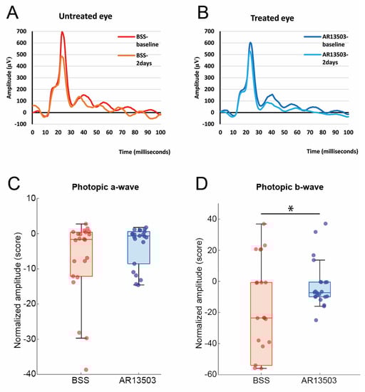 ERG recordings two days after detachment and with reattachment. (A,B) Representative waves of cone photopic b-wave for a BSS-untreated eye and an AR13503-treated eye. (C) Box plot showing normalized amplitude of photopic a-wave. There is no significant difference in a-wave amplitudes at two days from baseline recordings for both untreated and treated eyes. (D) Box plot showing normalized amplitude of photopic b-wave. BSS-untreated eyes have lower amplitudes at 2 days compared to baseline than AR13503 treated eyes, * p = 0.0004, n = 5 animals, an average of 5 recordings, repeated three times per animal. For box plots, whiskers are the standard deviation; dots represent all data points.