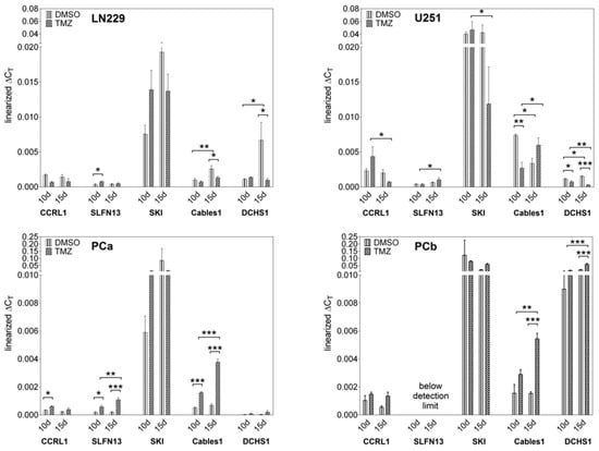 Concerning gene regulation under TMZ-promoted cellular dormancy entry and exit, differences were observed amongst the regarded cells. Overall, a more homogeneous pattern of gene regulation was found, particularly within the primary culture group. Whereas most of the examined genes exhibited an upregulation in dormancy entry and exit in the primary cultures, the cell lines revealed a more complex profile of gene regulation (Figure 1). In detail, in LN229, CCRL1 showed downregulation, albeit only in tendency, both entering and leaving quiescence. Furthermore, a statistically significant upregulation of gene expression was observed for SLFN13 (p = 0.017), whereas Cables1 (p = 0.028) and DCHS1 (p = 0.026) revealed a downregulation in TMZ-promoted dormancy exit. Furthermore, Cables1 (p = 0.008) and DCHS1 (p = 0.026) showed a significantly higher gene expression after 15 days of stimulation with DMSO in comparison to 10 days of stimulation. Albeit not statistically significant, SKI was found to be slightly upregulated during the entry and downregulated during the exit of TMZ-promoted dormancy; however, high standard deviations were observed. U251 cells revealed the downregulation of CCRL1 (p = 0.016) after 15 days of stimulation with TMZ in comparison to 10 days. Contrary to this, SLFN13 (p = 0.019) was found to be upregulated after 15 days of stimulation with TMZ. In accordance with LN229, the expression of SKI tended to be downregulated during TMZ-promoted dormancy exit in U251 cells, and a significant downregulation was observed when comparing 10 and 15 days of TMZ stimulation (p = 0.049). Whereas Cables1 revealed a downregulation during TMZ-promoted dormancy entry (p = 0.004) and a trend of upregulation during exit, DCHS1 was downregulated in both scenarios (p entry = 0.011; p exit < 0.001). In addition, DCHS1 revealed an upregulation after 15 days of stimulation with DMSO versus 10 days (p = 0.016), and a downregulation after 15 days of stimulation with TMZ in comparison to after 10 days of treatment (p = 0.005). Concerning the primary cultures, tendencies or even statistically significant upregulations for CCRL1 (PCa: p entry = 0.021) and Cables1 (PCa: p entry = 0.003; p exit < 0.001; PCb: p exit < 0.001) during TMZ-promoted dormancy entry and exit were observed. Whereas SLFN13 was found to be upregulated during the entry and exit of TMZ-promoted dormancy in PCa (p entry = 0.022; p exit < 0.001), no expression of the gene was observed in PCb. However, DCHS1 (p < 0.001), which was only detected in a low amount and not significantly regulated in PCa under TMZ-promoted dormancy, revealed an upregulation during dormancy exit in PCb. In PCa, SLFN13 (p = 0.007) and Cables1 (p < 0.001), and in PCb, Cables1 (p = 0.004) and DCHS1 (p < 0.001), exhibited upregulation after 15 days of TMZ stimulation in comparison to 10 days of stimulation. Data are presented in Figure 1.
