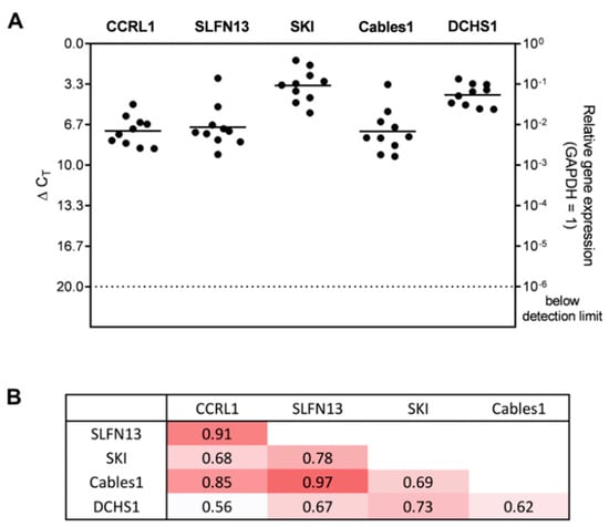To determine potential links between the selected genes, a correlation analysis was performed. All genes revealed positive correlations with each other. Particularly strong correlations were found for CCRL1 and SLFN13 (corr. = 0.91), SLFN13 and Cables1 (corr. = 0.97), and CCRL1 and Cables1 (corr. = 0.85). Medium correlations were detected for SKI and DCHS1 (corr. = 0.73), SKI and Cables1 (corr. = 0.69), SKI and CCRL1 (corr. = 0.68), Cables1 and DCHS1 (corr. = 0.62), and DCHS1 and CCRL1 (corr. = 0.56) (see Figure 2B).