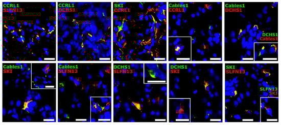 Immunofluorescence double-staining of the selected molecules. Human GBM ex vivo sections (n = 5, different patients; n = 1, technical replicate for each patient) were immunofluorescently stained regarding the presence of co-staining (yellow) for CCRL1, SLFN13, SKI, Cables1, and DCHS1 (green and red, respectively). Nuclei appear blue. Magnification 400×; white bar = 20 µm. CCRL1: Chemokine (C-C Motif) Receptor-Like 1; SLFN13: Schlafen 13; SKI: Sloan-Kettering Institute; Cables1: Cdk5 and Abl Enzyme Substrate 1; DCHS1: Dachsous Cadherin-Related 1; GBM: Glioblastoma.