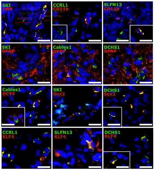 CCRL1, SLFN13, SKI, Cables1, and DCHS1 were stained with or nearby vWF to different extents. Whereas SLFN13, SKI, and Cables1 mainly exhibited direct co-staining with vWF, respectively, DCHS1 and especially CCRL1 also seemed to be expressed in different structures of the same vWF-positive cell. Concerning the microglial marker, CD11b, CCRL1, SLFN13, SKI, and DCHS1 seemed to be expressed in different structures of the same CD11b-positive cell. In contrast, Cables1 revealed either a co-staining or was found to be stained separate from CD11b. All of the examined dormancy-associated markers were also found to be stained in GFAP-positive areas. In particular, SKI, Cables1, and DCHS1 revealed a co-staining with GFAP. Interestingly, all of the mentioned markers exhibited individual co-staining patterns with stemness markers. Since tumor stem-like cells are known to represent only a small subpopulation within the total tumor mass (ranging from ~2–20% depending on GBM and stem-like cell subtypes []), only single or small groups of double-positive cells have usually been found. Whereas CCRL1, SLFN13, and SKI most frequently appeared directly co-stained with the investigated stemness markers, Cables1 and DCHS1 also often seemed to be stained in different structures of the same cell. Single positive cells for all examined markers were detected. Representative staining examples are presented in Figure 4.