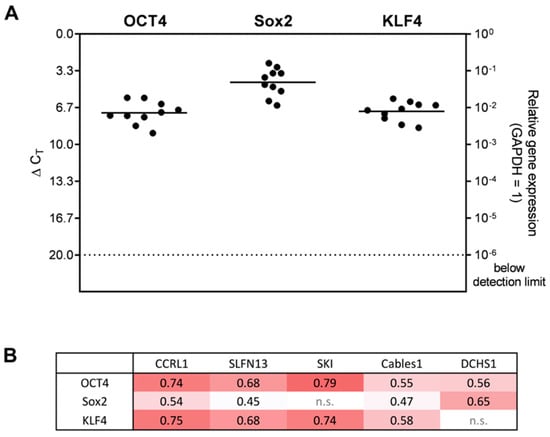 Based on the previously described finding of a co-staining for CCRL1, SLFN13, SKI, Cables1, and DCHS1 with stemness markers, respectively, we examined the gene expressions of OCT4, Sox2, and KLF4 in human GBM ex vivo samples. All stemness markers were clearly detected in the samples to different extents (Figure 5). The highest gene expression was found for Sox2 (average ΔCT = 4.37), followed by KLF4 (average ΔCT = 7.0), and OCT4 (average ΔCT = 7.14). To validate the detected link between the genes regulated under TMZ-promoted dormancy and the stemness markers, we performed a correlation analysis. Positive correlations were found, especially for the stemness markers OCT4 and KLF4 with CCRL1, SLFN13, and SKI. In detail, medium correlations were found for OCT4 and SKI (corr. = 0.79), CCRL1 (corr. = 0.74), and SLFN13 (corr. = 0.68); and for KLF4 and CCRL1 (corr. = 0.75), SKI (corr. = 0.74), SLFN13 (corr. = 0.68), and Cables1 (corr. = 0.58). Sox2 exhibited medium correlations with DCHS1 (corr. = 0.65), and CCRL1 (corr. = 0.54). Sox2 and Cables1 (corr. = 0.47), as well as Sox2 and SLFN13 (corr. = 0.45) only revealed weak correlations.