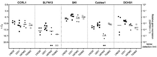 Except for SLFN13 (ΔCT = 11.08), the patient-derived GBM stem-like cells (n = 8) also mostly revealed an expression of the examined markers. DCHS1 (average ΔCT = 7.26) exhibited the highest gene expression among all markers, closely followed by SKI (average ΔCT = 7.44). The lowest gene expressions were observed for Cables1 (average ΔCT = 11.15), and CCRL1 (average ΔCT = 12.00). Data are shown in Figure 7.