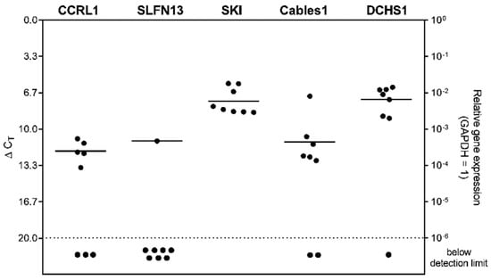 CCRL1 is an atypical chemokine receptor that was shown to predominantly exhibit tumor-restricting effects in different malignancies [,,]. However, other studies found the promotion of epithelial-to-mesenchymal transition (EMT) by CCRL1 and hence postulated a tumor-promoting effect []. SLFN13 belongs to a family of genes that are involved in cell cycle regulation and mediate growth-inhibitory responses. Its function, especially in cancer, is still poorly understood. An analysis of “The Cancer Genome Atlas” database revealed the downregulation of SLFN13 in breast cancer, lung squamous carcinoma, prostate cancer, and rectal carcinoma, whereas the protein was upregulated in pancreatic- and renal-cell carcinoma []. SKI is a proto-oncogene overexpressed in tumor cells of various malignancies and hence involved in the growth, proliferation, invasion, metastasis, and tumor progression of cancer cells [,,]. However, SKI was also shown to express the effect of a tumor suppressor gene in lung cancer []. Cables1 is a cyclin-dependent kinase-binding protein that was shown to be involved in the cell cycle, mitosis, cell death, development, and differentiation [,]. In multiple types of cancer, a very frequent loss of Cables1 has been observed which implies a potential suppressive effect on tumorigenesis []. However, a strong Cables1 expression was found in breast and pancreatic cancers []. DCHS1, also known as Cadherin (CDH)19, belongs to the cadherin superfamily and establishes and maintains intercellular connections []. It has been attributed to an important role in development, especially in the proliferation and differentiation of neural progenitor cells []. In different tumor types, DCHS1 seems to execute a tumor-suppressive effect [,,].