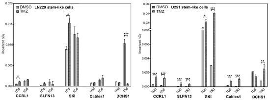 Interestingly, the results in LN229 and U251 stem-like cells showed similar trends to those obtained for native LN229 and U251, although there were clear differences in some aspects (please compare to Figure 1). For example, in the LN229 and the U251 stem-like cells, similar to the respective native cells, SKI showed the highest expression in both dormancy entry and exit. Similar to the native cells, a statistically significant induction of SKI was observed for both stem-like cell types after 10 days of TMZ stimulation compared to the control (LN229: p = 0.015; U251: p = 0.0216), which was more pronounced in LN229 stem-like cells. When considering dormancy exit, SKI was slightly downregulated in LN229 stem-like cells, but further induced in U251 stem-like cells, and this was also in contrast to native U251 cells (p < 0.0001). CCRL1 and SLFN13 were rather lowly expressed in both stem-like cell types but showed partly significant induction of gene expression compared to the controls, respectively, after 10 days of TMZ stimulation and a further 15 days of recovery (CCRL1, LN229, entry: p = 0.0170; CCRL1, U251 entry and exit: p = 0.0001; SLFN13, U251, entry: p = 0.0004, and exit: p < 0.0001). The Cables1 expression level was at a rather low level in LN229 and U251 stem-like cells and was partially significantly induced in both cell types in dormancy entry and exit (U251 entry and exit: p = 0.0005). Interestingly, this aspect was not observed in native LN229 and U215 cells. Finally, a strong statistically significant reduction in DCHS1 expression in dormancy exit was observed, particularly in LN229 stem-like cells (p < 0.0001), which was consistent with the results observed in native LN229 cells. DCHS1 expression in U251 stem-like cells was more intermediate and was significantly induced in dormancy exit (p < 0.0096), whereas a reduction in gene expression was observed in native U251 cells in dormancy exit compared to the control.
