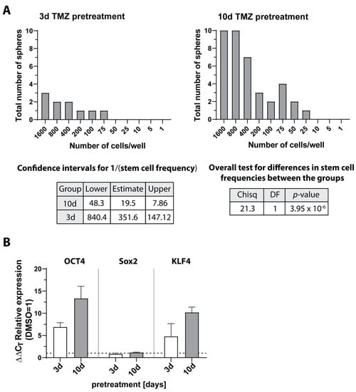 To further support these results, we next performed neurosphere formation assays with extreme limiting dilution analysis (ELDA) to investigate sphere formation capacity after pretreatment with TMZ for 3 or 10 days. Here, previous work by our group using native LN229 as an example has shown that LN229 cells pretreated with TMZ for 10 days exhibited a higher self-renewal capacity compared to cells pretreated for a shorter time, yielding sphere formation even at high dilutions []. Since these studies were previously performed only with native LN229, we now performed ELDA analysis with patient-derived primary cells (native PCa cells). The data are displayed in Figure 9. Similar to the results observed for LN229 cells, 10 days of pretreatment with TMZ resulted in a higher neurosphere formation capacity of PCa cells in comparison to 3 days of pretreatment (Figure 9A). In accordance with this, induction of the stemness markers OCT4 and KLF4 was more pronounced after 10 days of TMZ pretreatment, whereas Sox2 expression remained unaffected (Figure 9B).