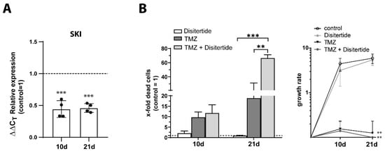 Cytotoxic and antiproliferative effect of TMZ application with simultaneous inhibition of SKI in GBM cells. LN229 cells were treated with TMZ + Disitertide (500 µM TMZ, 100 µg/mL Disitertide) for 10 days, followed by another 11 days without TMZ stimulation but with continuous addition of Disitertide (100 µg/mL). (A) Gene expression of SKI was quantified by qRT–PCR at different time points of treatment. The induction of gene expression upon stimulation with Disitertide was displayed as n-fold expression changes = 2∆CT control − ∆CT stimulus. (B) Death rates were obtained by performing a cytotoxicity assay after 10 and 21 days of stimulation, respectively. The cell survival/proliferation was determined by counting viable cells at days 0, 10, and 21 of the treatment. The percentages [%] of dead cells were calculated as the n-fold number of viable cells. n = 2, biological replicates, with n = 2, technical replicates each. The significances between different stimulations were determined using either a two-tailed Student’s t-test (A) or a two-way ANOVA test followed by a Tukey´s multiple-comparison test (B) (** p < 0.01; *** p < 0.001). Error bars correspond to the standard deviation. TMZ: Temozolomide; SKI: Sloan-Kettering Institute; GBM: Glioblastoma; qRT–PCR: Reverse transcription and quantitative real-time polymerase chain reaction; ANOVA: analysis of variance.
