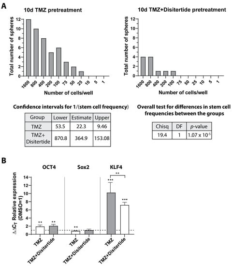 The self-renewal capacity of 10- versus 3-day-TMZ-pretreated cells and 10 day-TMZ- or TMZ + Disitertide-pretreated cells were measured using an extreme limiting dilution analysis (ELDA) as described before []. Briefly, remaining cells after treatment were determined, and decreasing numbers (1600–800–400–200–100–75–50–25–10–5–1 cells per well) of cells were cultured in neurosphere medium (see above), plus 20 ng/mL of bFGF and 20 ng/mL of EGF as described before []. Cultures were maintained until day 10 when the number of spheres per well and wells containing spheres for each cell plating density (number of positive cultures) were recorded and plotted using the online ELDA program25 (http://bioinf.wehi.edu.au/software/elda, accessed on 13 April 2023) [].