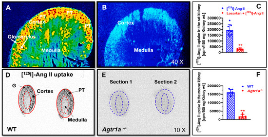 In vivo autoradiographic micrographs showing the intracellular uptake of systemically infused radiolabeled [125I]-Ang II in the kidney cortex, primarily in the glomeruli and proximal tubules, in rats and mice. (A) Intracellular uptake of [125I]-Ang II in the kidney cortex of a representative adult male Sprague-Dawley rat. (B) The intracellular uptake of [125I]-Ang II in the rat kidney cortex was blocked by pretreatment with the AT1 receptor blocker losartan, 20 mg/kg/day, p.o., for 1 week in a representative adult male Sprague-Dawley rat. (C) Quantitative data of AT1 receptor-mediated intracellular uptake of [125I]-Ang II in the rat kidney (n = 8). Levels of intracellular [125I]-ANG II uptake in the rat kidney are keyed to the color calibration bar, with red representing the highest (H) and blue the background (L) level of uptake. (D) Intracellular uptake of [125I]-Ang II in the kidney cortex of a representative adult male C57BL/6J mouse (WT). (E) The intracellular uptake of [125I]-Ang II in the kidney cortex was blocked in a representative global AT1a receptor-deficient mouse (Agtr1a-/-). (F) Quantitative data of AT1a receptor-mediated intracellular uptake of [125I]-Ang II in the mouse kidney (n = 8). G, glomerulus. PT, proximal tubule. ** p < 0.01 vs. control rat or wild-type mouse kidney.