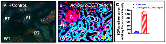 We then designed and constructed an adenovirus-mediated, proximal tubule-specific, intracellular Ang II fusion protein, Ad-Sglt2-ECFP/Ang II, for in vivo expression in wild-type mice, as described in [36,37,41]. Figure 3 shows that control mice showed minimal autofluorescence in the proximal tubules of the kidney (Figure 3A, C). By contrast, intensive cyan fluorescence (blue green) representing the expressed Ad-Sglt2-ECFP/Ang II was observed in the proximal tubules of the mouse kidney (p < 0.01 vs. control) (Figure 3B). No significant expression of Ad-Sglt2-ECFP/Ang II was visualized in the glomerulus (Figure 3B). These results demonstrated a proof-of-concept approach to expressing an intracellular Ang II fusion protein in the proximal tubules of the kidney using the sodium and glucose cotransporter 2 promoter (Sglt2) to study the effects and mechanisms of intracellular Ang II-induced expression of sodium transporters or cotransporters in mouse proximal tubule cells (see below).