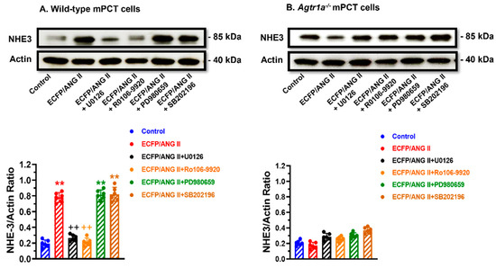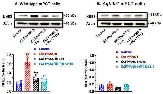 Effects of ECFP/Ang II on Na+/H+ exchanger 3 (NHE3) expression in wild-type and Agtr1a-/- mouse proximal tubule cells (mPCT). Panel (A) shows that the expression of ECFP/Ang II as a surrogate of intracellular Ang II stimulated NHE3 protein expression in wild-type mPCT cells, and this response was significantly attenuated by losartan, an AT1 receptor blocker, and PD123319, an AT2 receptor antagonist. Panel (B) shows that the expression of ECFP/Ang II had insignificant effects in Agtr1a-/- mPCT cells without or with losartan or PD123319 treatment. ** p < 0.01 vs. control; ++ p < 0.01 vs. ECFP/ANG II.