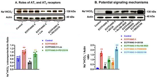 The roles of AT1 and AT2 receptors, the MAP kinases, and NF-κB signaling pathways in mediating ECFP/Ang II-induced Na+/HCO3- cotransporter expression in wild-type mPCT cells. Panel (A) shows that ECFP/Ang II significantly increased Na+/HCO3- expression, and the response was attenuated by losartan but not by PD123319, suggesting a dominant role of AT1 receptors in mPCT cells. Panel (B) shows that the MEK1/MEK2 kinase inhibitor U0126, the NF-κB activation inhibitor Ro 106–9920, and the MEK inhibitor PD 980659 attenuated the effects of ECFP/Ang II on expression, but the p38 MAP kinase inhibitor SB202196 had no effect on Na+/HCO3- expression. ** p < 0.01 vs. control WT mPCT cells. ++ p < 0.01 vs. WT mPCT cells transfected with ECFP/Ang II.