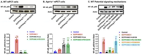 The roles of AT1 and AT2 receptors, the MAP kinases, and NF-κB signaling pathways in mediating ECFP/Ang II-induced NF-κB, p65 expression in wild-type and Agtr1a-/- mPCT cells. Panel (A) shows that ECFP/Ang II increased NF-κB, p65 expression in wild-type mPCT cells, and the response was attenuated by both losartan and PD123319, supporting an important role of AT1 and AT2 receptors in mediating ECFP/Ang II-induced NF-κB, p65 expression in wild-type mPCT cells. Panel (B) shows that ECFP/Ang II alone had no significant effect on NF-κB, p65 expression in Agtr1a-/- mPCT cells, but both losartan and PD123319 potentiated this response. Panel (C) shows that in wild-type mPCT cells, the effect of ECFP/Ang II on NF-κB, p65 expression was attenuated by the MEK1/MEK2 kinase inhibitor U0126, the NF-κB activation inhibitor Ro 106–9920, and the MEK inhibitor PD 980659, respectively. However, the p38 MAP kinase inhibitor SB202196 had no effect on ECFP/Ang II-induced NF-κB, p65 expression in wild-type mPCT cells. ** p < 0.01 vs. control WT or Agtr1a-/- mPCT cells. ++ p < 0.01 vs. WT mPCT cells transfected with ECFP/Ang II, or Agtr1a-/- mPCT cells transfected with ECFP/ANG II.