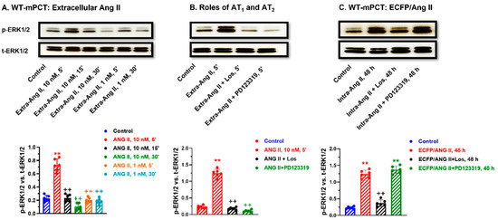 Comparisons of AT1 and AT2 receptor-mediated, extracellular Ang II- versus intracellular ECFP/Ang II-induced MAP kinases ERK1/2 activation in wild-type mPCT cells. (A) Time- and dose-dependent responses to extracellular Ang II stimulation with a peak response for 10 nM at 5 min. (B) The effect of losartan (an AT1 blocker) and PD123319 (an AT2 blocker). (C) The effect of losartan (an AT1 blocker) and PD123319 (an AT2 blocker) on intracellular ECFP/Ang II-induced MAP kinases ERK1/2 activation. These data suggest that both extracellular and intracellular Ang II activate MAP kinases ERK1/2 signaling in wild-type mPCT cells. ** p < 0.01 vs. control. ++ p < 0.01 vs. ECFP/Ang II.