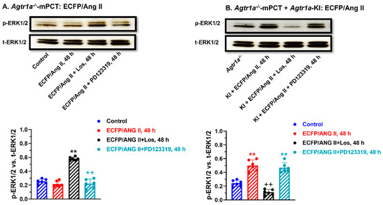 AT1 (AT1a) receptor-mediated, intracellular ECFP/Ang II-induced activation of the MAP kinases ERK1/2 signaling pathway in Agtr1a-/- mPCT cells without or with the knock-in of a full-length wild-type mouse AT1a receptor. ** p < 0.01 vs. control; ++ p < 0.01 vs. ECFP/Ang II + Los (A) or ECFP/Ang II (B), respectively.