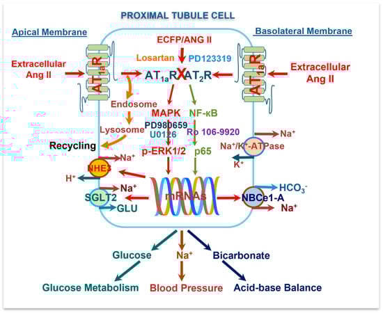 The schematic diagram summarizing the potential Ang II/AT1 (AT1a) and AT2/MAP kinases ERK1/2 and NF-κB signaling mechanisms by which extracellular and intracellular Ang II activates cell surface and intracellular AT1 (AT1a) and AT2 receptors to induce important transcriptional responses, i.e., the expression of NHE3 antiporter, SGLT2, and Na+/HCO3- cotransporters in mouse proximal tubule cells. The results of the present study suggest that intracellular Ang II and its receptors in the proximal tubules of the kidney may play important physiological roles in normal blood pressure regulation, glucose metabolism, and acid-base balance.