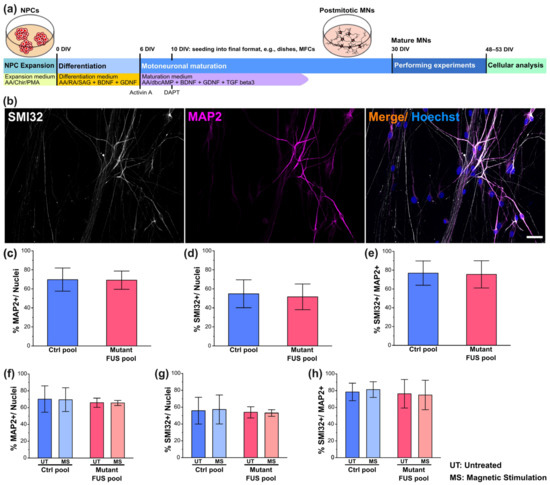 Characterization of iPSC-derived spinal motoneurons (MNs). (a) Timeline cartoon of the differentiation pipeline of MNs derived from healthy persons and FUS-ALS patients. AA: Ascorbic acid, Chir: Chiron, PMA: Purmorphamin, RA: Retinoic acid, SAG: Smoothened Agonist (Hedgehog pathway activator, activates Smoothened), dbcAMP: dibutyryl-cyclo-Adenosine monophosphate, BDNF: brain-derived neurotrophic factor, GDNF: glial-cell-derived neurotrophic factor, TGF beta3: tissue growth factor beta3. (b) IF microscopy of SMI32 (in white), MAP2 (in magenta) and Hoechst (in blue) of Ctrl MNs. Shown is Ctrl1 (Table 1) as a representative example. Refer to Figure S1 for more representative examples from other lines. Scale bar = 40 µm. (c–e) Quantitative image analysis of panel b of untreated Ctrl (in blue, pooled Ctrl1-3, FUS-GFP WT) and mutant FUS lines (in red, pooled FUS R521L, R521C, P525L, R495QfsX527) (Table 1) revealed no difference in Ctrl versus mutant FUS in any neuronal marker level as expressed as a percentage of marker-positive cells with respect to the entire Hoechst-positive cell population (c,d) or the entire MAP2-positive neuronal population (e). Refer to Figure S2 for the individual lines used for the pooled analysis. (f–h) Same as panel (c–e) but for magnetically stimulated (MS) versus untreated Ctrl (in blue, pooled Ctrl2 and FUS-GFP WT) and mutant FUS (in red, pooled FUS-GFP P525L and R495QfsX527) (Table 1) MNs. Refer to Figure S4 for the individual lines used for the pooled analysis. Note that neither the mutation nor the MS treatment had any impact on any neuronal marker level. Error bars show the SD over all pooled lines and 3–4 individual experiments per line. Ten images per individual line, condition (UT or MS) and experiment were analyzed. One-way ANOVA with Bonferroni post-hoc test revealed no significant alteration in any pairwise comparison.