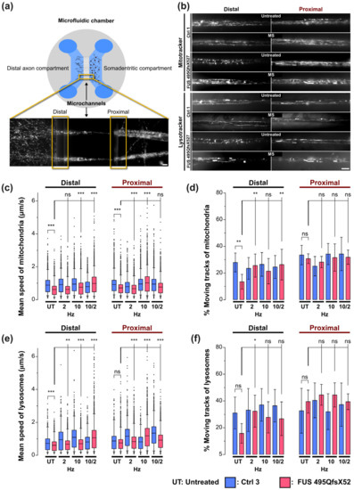 Beneficial impact of magnetic stimulations on axonal trafficking in FUS-ALS. (a) MNs derived from healthy persons and FUS-ALS patients were seeded and further differentiated in compartmentalized MFC cultures at 10 DIV to separate axons from the soma-dendritic site. Cartoon illustrating the standardized axonal readout positions distal versus proximal for live imaging at 48 DIV. (b) Movies acquired with Mito- and Lysotracker at distal and proximal axonal readout positions are displayed as maximum intensity projections (MIPs) to visualize organelle motility. Corresponds to Movies S1 and S2. Note that untreated mutant FUS MNs apparently exhibited decreased mitochondrial and lysosomal motility at the distal site compared to Ctrl MNs, whereas proximal motility remained physiological. Shown are the FUS R495QfsX527 mutant and Ctrl1 as representative examples (Table 1). MS at 10 Hz led to the rescue of these distal trafficking defects in mutant FUS. Scale bar = 10 µm. (c) Quantitative tracking analysis of mitochondria as shown in panel (b), box plots of track mean speed of individual organelles and (d) percentage of moving tracks per movie in the entire movie pool from 3 independent experiments, whiskers span 95% of the entire data sets, center lines represent the means. A one-way ANOVA with the Kruskal–Wallis post-hoc test was utilized to reveal significant differences in pairwise comparisons. Asterisks: highly significant alteration in indicated pairwise comparison, * p ≤ 0.05, ** p ≤ 0.01, *** p ≤ 0.001 and ns: no significant difference. (e) Same as panel (c) but for lysosomes. (f) Same as panel (d) but for lysosomes. Refer to Table S1 for more results of the ANOVA. Sample size for panels (c,e): thousands of organelle tracks. Sample size for panels (d,f): 45 movies.
