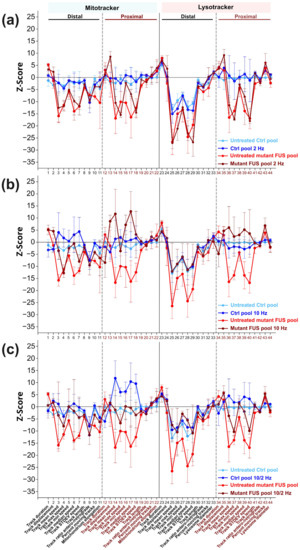 Next, we wished to analyze the impact of MS on these complex axonal trafficking logistics in more detail, as a tracking analysis restricted to mean speed only might be insufficient to understand the extent to which MS was capable of restoring a pathological impairment back to phenotypic wild-type levels. To this end, we took advantage of our established phenotypic high content (HC) profiling method for a more comprehensive analysis of axonal organelle motility [21,27]. In brief, we deduced multiparametric HC profiles for each line (Table 1) that contained the aforementioned mean speed and track displacement along with other numerical descriptors to obtain a master set of 11 parameters (detailed in Materials and Methods) four times, owing to two readout positions (distal versus proximal) and two markers (Mito- and Lysotracker) assembled to a signature of 44 parameters in total. Each parameter was expressed as a Z-score deviation from pooled untreated WT control lines at the proximal readout and plotted with a connecting line to obtain a graphical signature, i.e., the HC profile (Figure 3a–c). In essence, the multiparametric HC profile served as a quantitative, comprehensive readout to assess natural disease states and their restorations back to wild-type levels through MS. We tested the impact of the AC field at 2 Hz (Figure 3a), 10 Hz (Figure 3b) and the combinatorial sequence of 10/2 Hz (Figure 3c) (detailed in Materials and Methods). Due to moderate inter-line variability, each parameter Z-score was averaged over all four control and three mutant FUS lines, respectively, to obtain a consensus mean profile for the Ctrl (in blue) and mutant FUS pools (in red), with error bars representing the deviation across the individual lines (Figure 3a–c). The HC profiles of individual cell lines are provided in Figure S5.