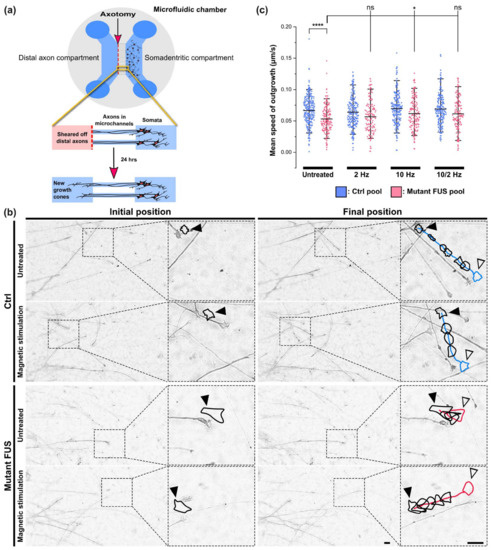 Improvement of axonal regeneration of FUS-ALS in response to magnetic stimulation (MS). (a) Cartoon illustrating the in vitro axotomy in MFCs at the distal site followed by new axonal outgrowth of growth cones imaged after 24 h. (b) Representative example images (DIC brightfield) of advancing growth cones 24 h after axotomy as shown in panel a on Ctrl 1 versus FUS R495QfsX527 MNs (Table 1) with growth cone contour lines (in black) and colored tracks (blue: Ctrl, red: mutant FUS) highlighted with an offset in order not to obscure the imaged axon. The contoured growth cone of the last movie frame is colored to highlight the final position (blue: Ctrl, red: mutant FUS). Shown are the initial positions of the growth cones (closed black arrowheads) in the first movie frame and their final positions (open black arrowheads) in the corresponding last frame after 2 h of movie recording. Scale bars = 10 µm. (c) Quantitative analysis of movies, as shown in panel (b). The deduction of mean growth cone speed was performed as described in Section 2.12. Material and Methods. The impact of MS at different frequencies was assessed in four pooled healthy controls and three pooled FUS-ALS patients. Refer to Figure S6 for individual lines. N = 3–4 independent experiments. Scatter dot plots display mean speed values of individual growth cones, whiskers show data ranges from 5–95%, and center lines show the populations’ means. A one-way ANOVA with Bonferroni post-hoc test was utilized to reveal significant differences in pairwise comparisons of the different MS treatment conditions (untreated, 2 Hz only, 10 Hz only, 10/2 Hz). Asterisks: highly significant alteration in indicated pairwise comparison, * p ≤ 0.05, **** p ≤ 0.0001, ns: no significant difference. Sample size (=number of analyzed growth cones) for Ctrl pool untreated: 150, Ctrl pool 2 Hz: 134, Ctrl pool 10 Hz: 137, Ctrl pool 10/2 Hz: 133, mutant FUS pool untreated: 93, FUS pool 2 Hz: 68, FUS pool 10 Hz: 83, FUS pool 2/10 Hz: 78.