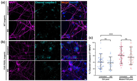Next, we wished to rule out possible detrimental side effects and probe for signs of apoptosis after the execution of our MS protocol at 10 Hz on cultured MNs. To this end, we performed immunofluorescent staining for the apoptotic marker cleaved caspase-3 (Figure 5a,b) of one non-isogenic (Ctrl 1 versus the severe mutant FUS 495QfsX527, Table 1) and one isogenic pair (FUS-GFP WT versus FUS-GFP P525L, Table 1). We determined the apoptotic fractions (i.e., percentages) in untreated Ctrl and mutant FUS cultures in MAP2-positive neurons only, thereby capturing MNs and possibly other neuronal subtypes in our differentiation protocol. We found significantly augmented apoptosis in the untreated mutant FUS pool over the Ctrl pool (Figure 5c and Figure S8, Table S2). These findings at 48 DIV (Figure 1a) are in good agreement with our previous report showing augmented apoptosis in the FUS mutants at 60 DIV and beyond [13]. When we tested our MS protocol, the apoptotic fractions did not change either in the Ctrl pool or in the mutant FUS pool (Figure 5c). However, there was a rescue in some individual lines, whereas we did not detect a harmful effect of MS in any cell line investigated (Figure S8, Table S2).
