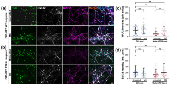 Rescued MAP2 in response to MS in mutant FUS MNs. (a,b) Immunofluorescent staining of MAP2 (in magenta) and SMI32 (in white) in Ctrl (a) and mutant FUS (b) MNs. Shown are the isogenic pairs of FUS-GFP WT and FUS-GFP P525L as representative examples. Scale bar = 20 µm. (c) Image quantification of panels a and b of the Ctrl (Ctrl1 and FUS-GFP WT, Table 1) and mutant US pool (FUS R495QfsX527 and FUS-GFP P525L); normalized MAP2 intensities per image are shown as scatter dot plots with per-image values. (d) Likewise, for SMI32. Refer to Figure S9 for individual lines. Note the decreased MAP2 level in untreated mutant FUS, which reverted back to Ctrl levels through MS (panel c). Center lines represent the means and whiskers span 95% of the data points from 4 individual experiments. Ten images per individual line, condition (UT or MS) and experiment were analyzed. A one-way ANOVA with a post-hoc Kruskal–Wallis test was utilized to reveal significant differences in pairwise comparisons. Asterisks: highly significant alteration in indicated pairwise comparison, ** p ≤ 0.01, *** p ≤ 0.001, ns: no significant difference.