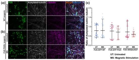 As for post-translationally modified tubulin, our immunofluorescent staining using a specific antibody against acetylated tubulin revealed no change when normalized by total α–tubulin in the untreated mutant FUS versus Ctrl pool, nor after MS (Figure 7).