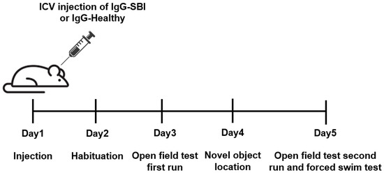Experimental timeline. A single intraventricular (ICV) injection of a pool of IgGs isolated from the sera of symptomatic women with silicone breast implants (n = 10; IgG-SBI) or from healthy women (n = 10; IgG-healthy) was administrated into ICR male mice (n = 10 per each group) on Day 1. Naïve untreated mice were used as controls. Various behavioral studies were conducted in the following four days.