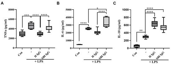 IgGs derived from women with silicone breast implants dysregulate LPS-induced cytokine secretion in activated human PBMCs. Total IgGs were isolated from healthy women (n = 10) or from symptomatic women with silicone breast implants (n = 10). Human PBMCs were isolated from healthy woman, seeded (500,000 cells/0.5 mL/well) and activated using LPS (2 ng/mL) for 18 h. Total IgGs (100 µg/mL) from each group were added concomitantly with LPS for 18 h. (A) TNFα, (B) IL—6 and (C) IL—10 cytokine levels were measured in the supernatants, 18 h after activation, by ELISA assay. Box-and-whisker plots showing medians and interquartile ranges of each cytokine level. The dark line within each box represents the median while top and bottom borders of the box represent the third and first quartiles. * p < 0.05, ** p < 0.01, *** p < 0.001, **** p < 0.0001. SBI—silicone breast implant, LPS—lipopolysaccharides, PBMCs—peripheral blood mononuclear cells, H—healthy.
