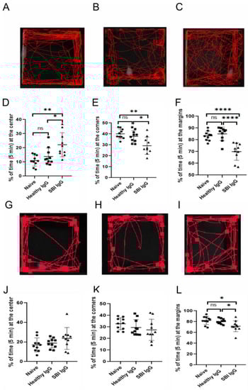 A pool of IgG antibodies isolated from the sera of symptomatic women with silicone breast implants (n = 10, suffering from cognitive impairment, depression, memory loss and widespread pain; Table 2) vs. IgGs derived from healthy women (n = 10; Table 2), were injected (intracerebroventricular (ICV) administrations) into the brain of ICR mice (Figure 1). Notably, the circulating titer of anti-β1 adrenergic receptor and anti-angiotensin II type 1 autoantibodies in these 10 symptomatic women with SBIs were significantly reduced vs. the 10 healthy women (p < 0.0001 and p < 0.001, respectively; Table 2). The changes in the titer of these antibodies is consistent with our recent observation regarding the importance of anti-β1-adrenergic-receptor autoantibodies in SBI-related illness and their significant correlation with autonomic-related manifestations reported by women with SBIs, such as depression [12]. The assessment of the animals’ behavior in the open field paradigm, two days after the injection (Day 3), revealed a strong preference of SBI-IgG injected mice for the field center crossing vs. the clear lateralization of naïve and healthy-IgG-injected ones (Figure 3A–C). Visual observations of the animal trajectories were further supported by a significant increase of time spent at the center in SBI-IgG-injected mice vs. the other two groups (p < 0.01, F2,29 = 8.195, one-way ANOVA with a Holm–Sidak post hoc, p < 0.01 SBI-IgG vs. Naïve (t = 3.902) and p < 0.05 SBI-IgG vs. healthy-IgG (t = 2.884); Figure 3D), as well as a corresponding marked decrease in the time spent at the corners (p < 0.01, F2,29 = 8.933, one-way ANOVA, with a Holm–Sidak post hoc, p < 0.01 SBI-IgG vs. Naïve (t = 4.012) and p < 0.05 SBI-IgG vs. healthy-IgG (t = 3.158); Figure 3E) and at the margins (p < 001, H2,29 = 17.21, Kruskal–Wallis One-way analysis of variance with ranks, with a Tukey post hoc addition, p < 0.001 SBI-IgG vs. Naïve (q = 5.496) and p < 0.001 SBI-IgG vs. healthy-IgG (q = 4.526); Figure 3F). Such dramatic preference for the arena center crossing vs. lateralization indicates that the SBI-IgG injection induced anxiolytic effects in the treated animals. Validity of the open field analysis was further supported by conducting the behavioral paradigm four days after the injection (Day 5), while a complete disappearance of the SBI-IgG effect was observed along with no significant effect on the animals’ preference for the center, though a slight trend was still identifiable (Figure 3G–L). The obtained results were further supported by analysis of the cumulative immobility time, which revealed that two and four days after the injection (Day 3 and Day 5), SBI-IgG-injected mice were immobile in the center of arena significantly longer than the other groups (p < 0.001, F2,27 = 17.48). Moreover, four days after the injections (Day 5), the immobility state of these mice was preserved (no significant difference in the time effect: p = 0.09, F1,27 = 2.92; two-way ANOVA; Supplementary Figure S2A,B). SBI-IgG-treated mice also revealed a further distance traveled within the center of the arena (p < 0.05, F2,27 = 4.97; two-way ANOVA), despite the total distance travelled within the whole arena remaining almost equal between the groups (Supplementary Figure S2A,B).
