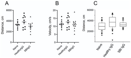 Passive transfer of IgGs, derived from symptomatic women with SBIs, into mice brains causes a reduction in locomotor activity. Locomotory activity parameters derived from open field tests as in Figure 3. (A) Summarized distance traveled by the tested animals as derived from trajectory files. (B) Average velocity of the animal movement calculated for the trajectories during the test elapsed time. Data presentation as in Figure 3D,E. (C). Summarized box-and-whisker plots of bootstrapped data derived from the simulation based on distribution of traveled distances as presented on Supplementary Figure S1. Circles—Naïve group, squares—Healthy IgG group, triangles—SBI IgG group.